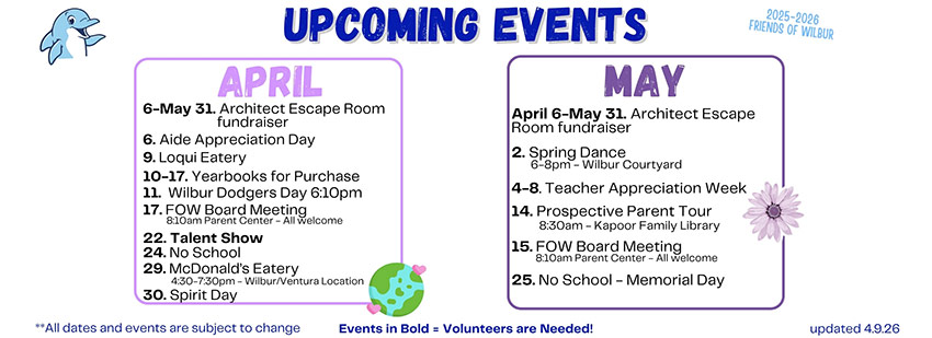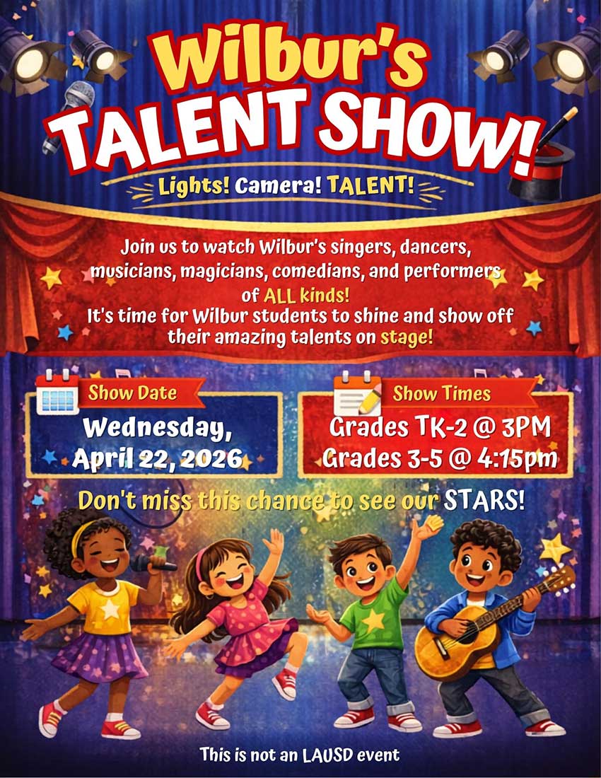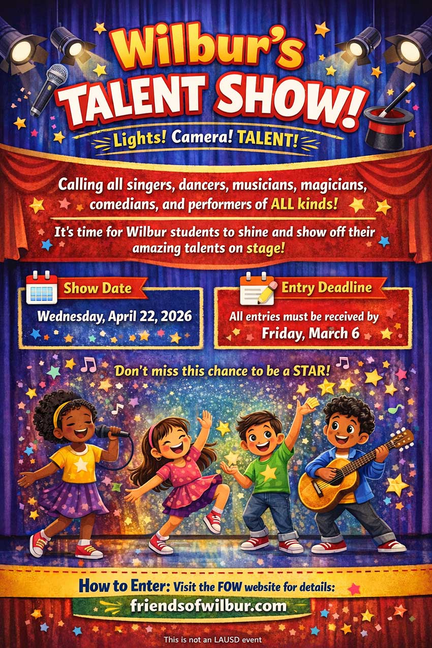 Does your child love to sing, dance, perform magic, tell jokes, or show off a special talent? Now’s their chance to shine on stage! The Talent Show takes place April 22, and all entries are due by Friday, March 6. We can’t wait to see our Wilbur stars shine! 🎤✨